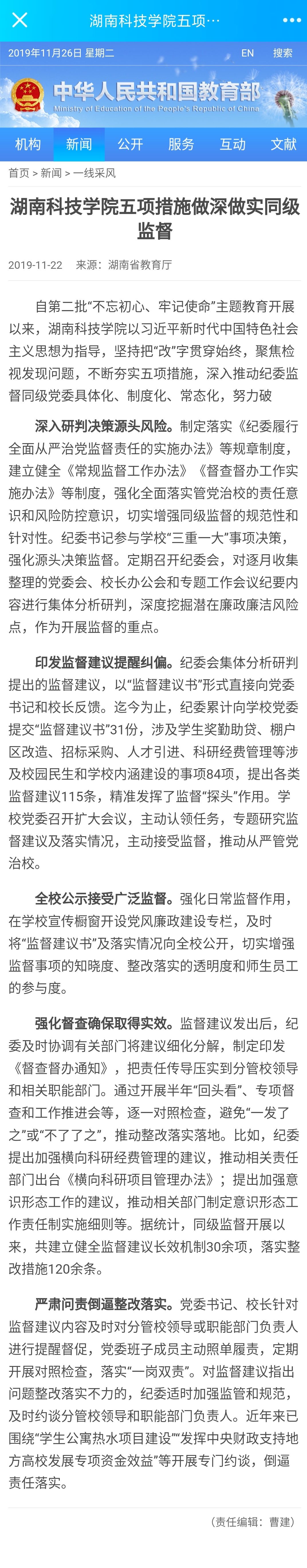 本网讯 11月22日,教育部官网以“万搏平台五项措施做深做实同级监督”为题,推介我校做深做实同级监督工作经验。