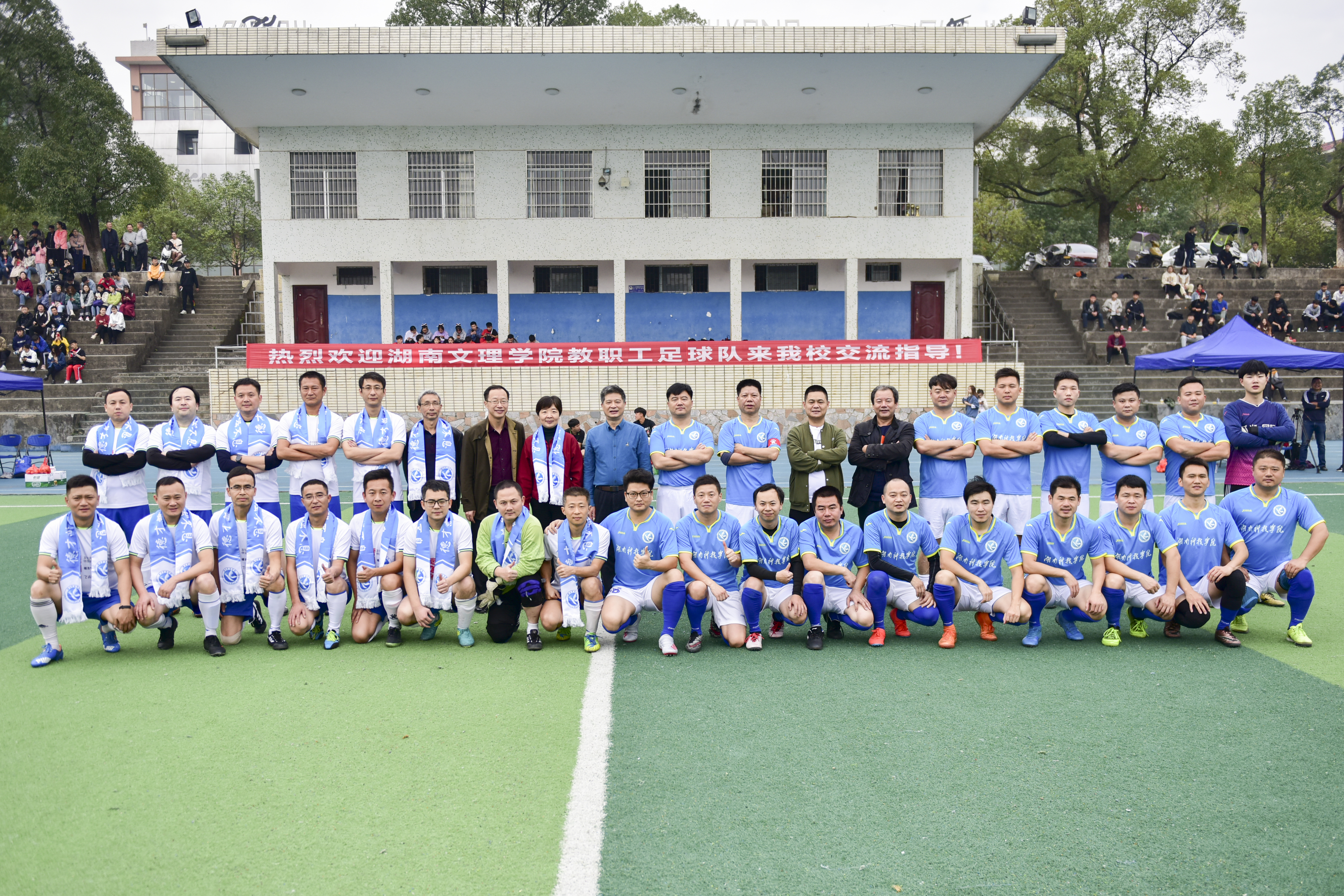 本网讯 11月24日,湖南文理学院教职工足球队一行14人来校交流,与我校教职工足球队进行了一场足球友谊赛。校长李钢、副校长程智开参加比赛,党委副书记、工会主席唐艳明到场为比赛开球并观赛。