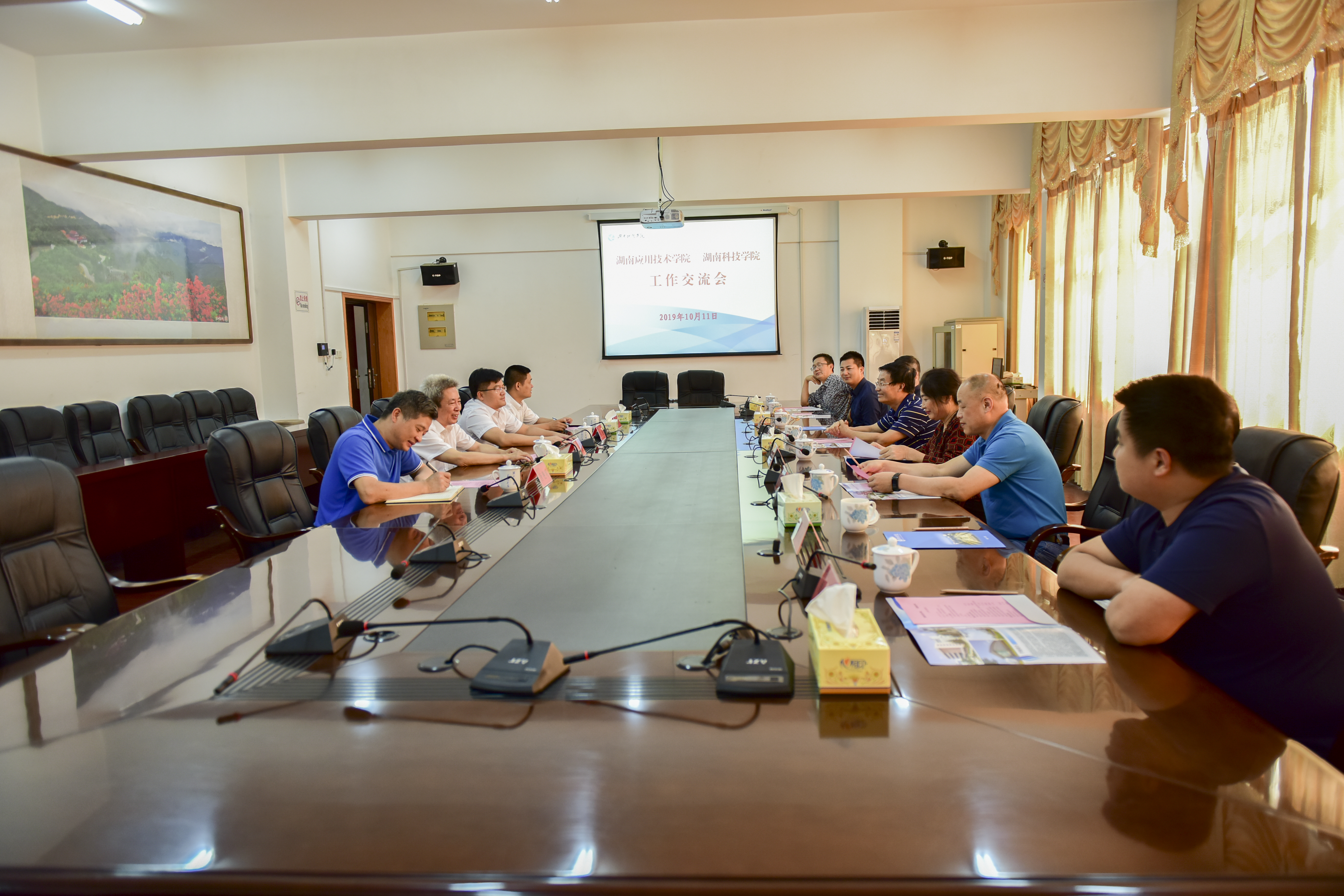 本网讯 10月11日,湖南应用技术学院董事长李少夫,副董事长齐淑兰,校长李旋旗,党委委员、常务副校长李敏以及人事处、设计学院负责人来学校交流访问。学校党委书记曾宝成,校长李钢,党委副书记、工会主席唐艳明参加工作交流会,会议由李钢主持。