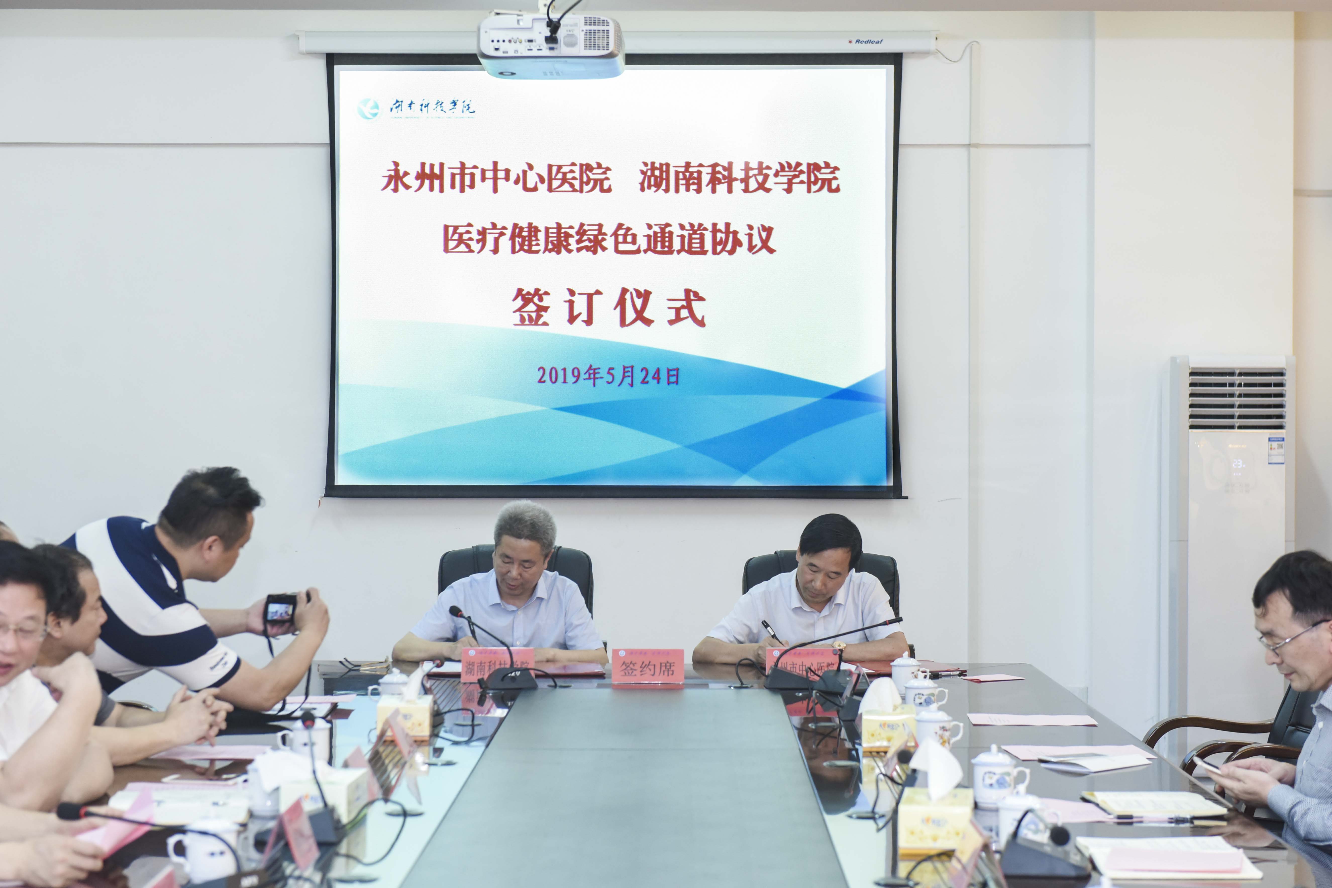 本网讯 5月24日上午,我校与永州市中心医院共建医疗健康绿色通道并举行协议签约仪式。永州市中心医院院长刘彬、党委书记赵承保,校党委书记、校长曾宝成,党委副书记、工会主席唐艳明,副校长吴小林出席,仪式由吴小林主持。