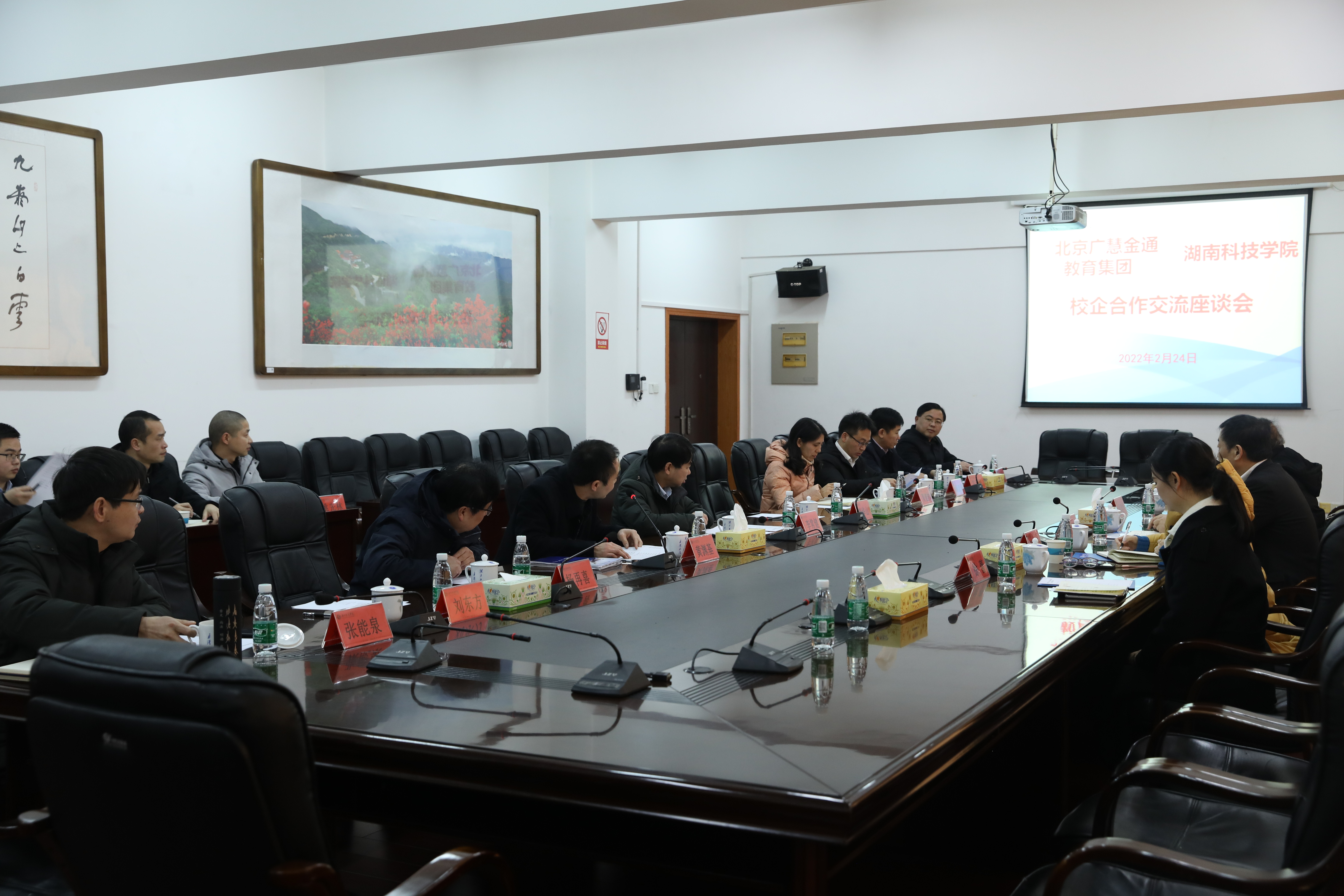 本网讯(记者 王跃)2月24日下午,我校与北京广慧金通教育集团交流座谈会在行政楼六楼会议室举行。校党委委员、副校长李常健,北京广慧金通教育集团常务副总经理付晓军出席会议。