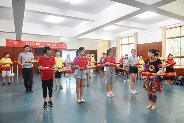 10日下午,在“‘瑶’望海峡,舞动青春”的永州舞蹈文化交流中,音乐与舞蹈学院胡玲梅老师以“永州江华瑶族长鼓舞”为主题,以生动有趣的语言向永台青少年们介绍了瑶族文化以及永州江华特色小长鼓,她从长鼓的种类、形状、表演形式、风格特点等多个角度带领大家走入瑶族舞蹈文化。随后,永台青少年们还共同欣赏了我校编排的瑶族舞蹈系列三部曲:《跳盘王》《打起铜锣追男崽》《过山》,欣赏完后,青少年们还饶有兴致地学习长鼓舞中的简单律动,相互交流探讨,场面温馨热闹,和谐友爱。