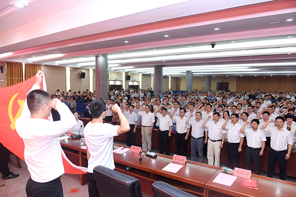 本网讯 6月29日下午,在党的生日即将到来之际,学校在潇湘大讲堂举行“七一”党员宣誓仪式。校党委书记陈弘,校党委副书记、校长曾宝成,全体校领导及直属党组织全体委员,全校各党支部委员,机关党委全体党员,受表彰的优秀共产党员、优秀党务工作者、先进党组织书记,学生党员代表,“微党课”比赛获奖党员代表参加了宣誓。仪式由曾宝成主持。