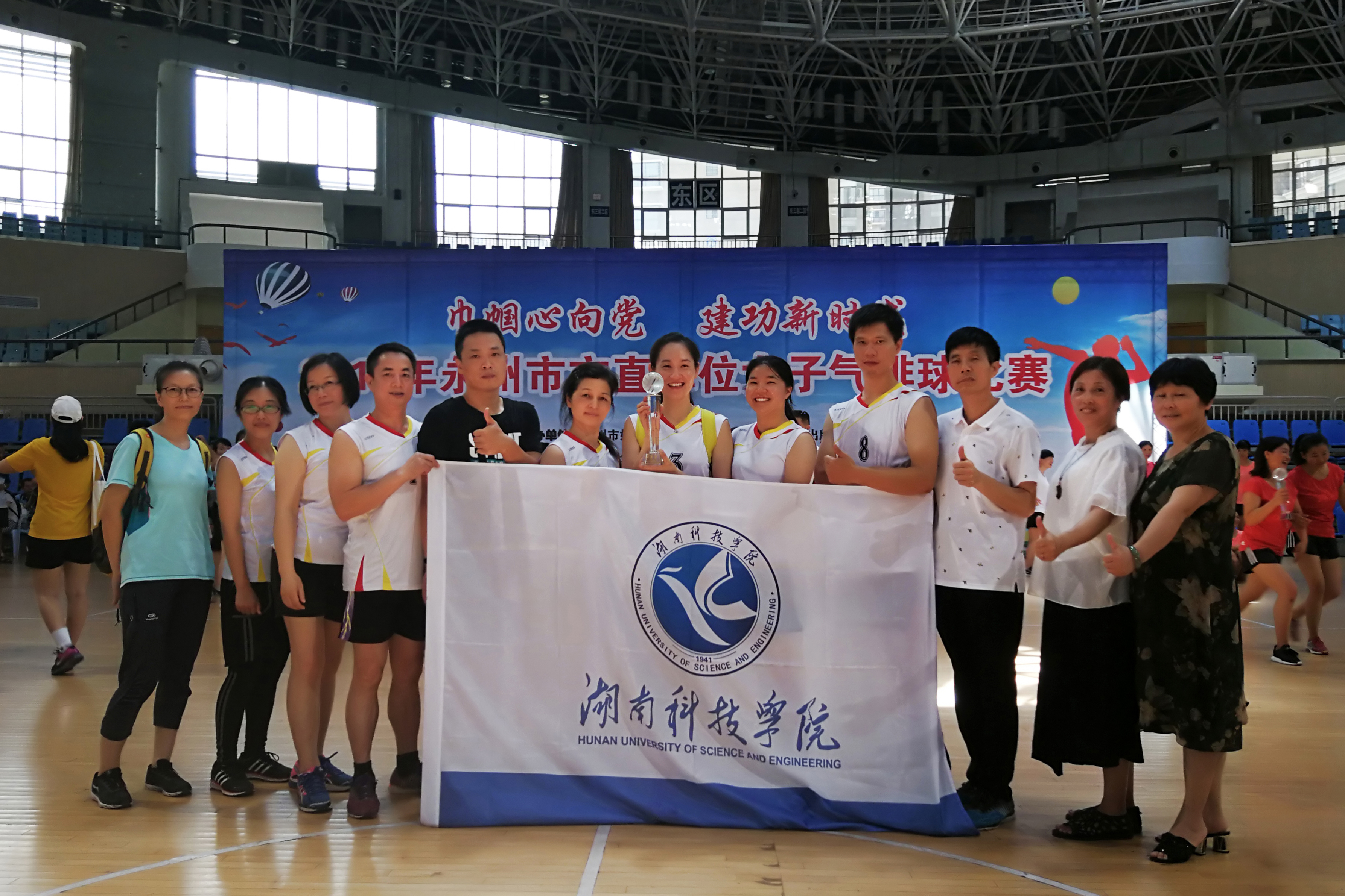 本网讯 6月29日上午,经过四天半紧张激烈的比赛,“巾帼心向党,建功新时代”2018年永州市直单位女子气排球比赛在市体育中心落下帷幕,我校气排球队荣获冠军。