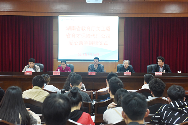 本网讯 3月28日下午,湖南省教育厅关工委、省育才关心青少年基金会和省育才保险代理有限公司爱心助学捐赠仪式在校举行。副校长程智开,校关工委、省育才保险代理公司驻学校负责人,资助专干及40名受资助学生参加捐赠仪式。