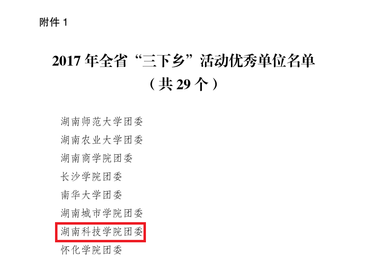 本网讯 近日,省委宣传部、团省委、省教育厅、省文明办、省学联印发《关于2017年全省大中专学生志愿者暑期文化、科技、卫生“三下乡”社会实践活动优秀单位、优秀个人、优秀指导者和优秀服务团队的通报》(湘团联〔2017〕51号),我校荣获2017年全省大中专学生志愿者暑期文化、科技、卫生“三下乡”社会实践活动“优秀单位”称号,土木与环境工程学院“保护古建筑,传承中华文化”实践团获评省“优秀服务团队”,张俭民等5名教师获评“优秀指导者”,郑尚明等8名学生获评“优秀个人”。