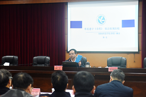 本网讯 12月13日晚,党委书记陈弘以“尊重遵守《章程》 依法依规治校”为主题为第四届教职工代表、工会会员代表进行专题培训,对《万搏平台章程》作全面深入地讲解分析。党委副书记唐艳明主持。