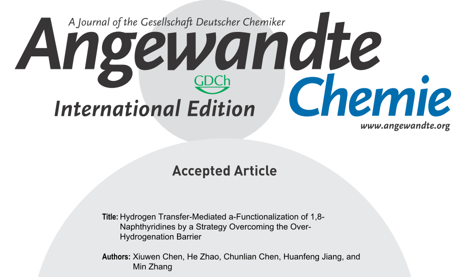 本网讯 近日,我校化学与生物工程学院陈修文博士以第一作者身份,在化学领域顶级期刊Angewandte Chemie(影响因子:11.994)上在线发表专题论文《Hydrogen Transfer-Mediated -Functionalization of 1,8-Naphthyrid- ines by a Strategy Overcoming the Over-Hydrogenation Barrier》。