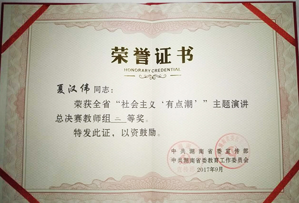 本网讯 9月24日,由省委宣传部、省委教育工委主办的“社会主义有点潮”主题演讲比赛决赛在湖南教育电视台举行,由我校宣传部选送的夏汉伟老师作品《用信仰托举梦想 用智慧追逐潮流》脱颖而出入围决赛荣获教师组二等奖。