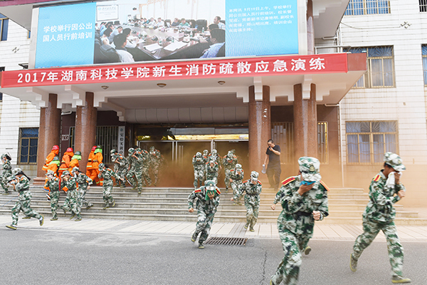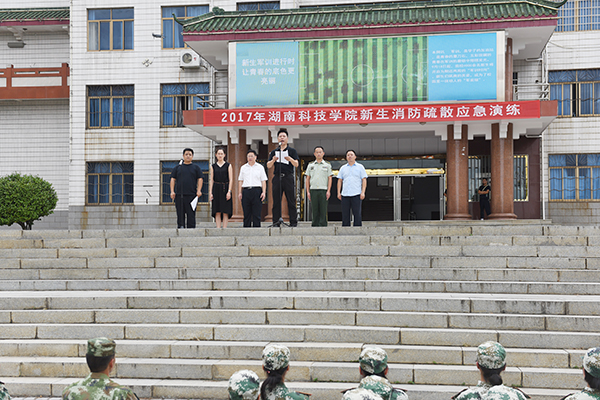 本网讯   9月25日下午,学校举行2017级新生应急疏散逃生及消防演练活动。副校长程智开,零陵区消防大队教导员周必成及相关部门负责人出席。