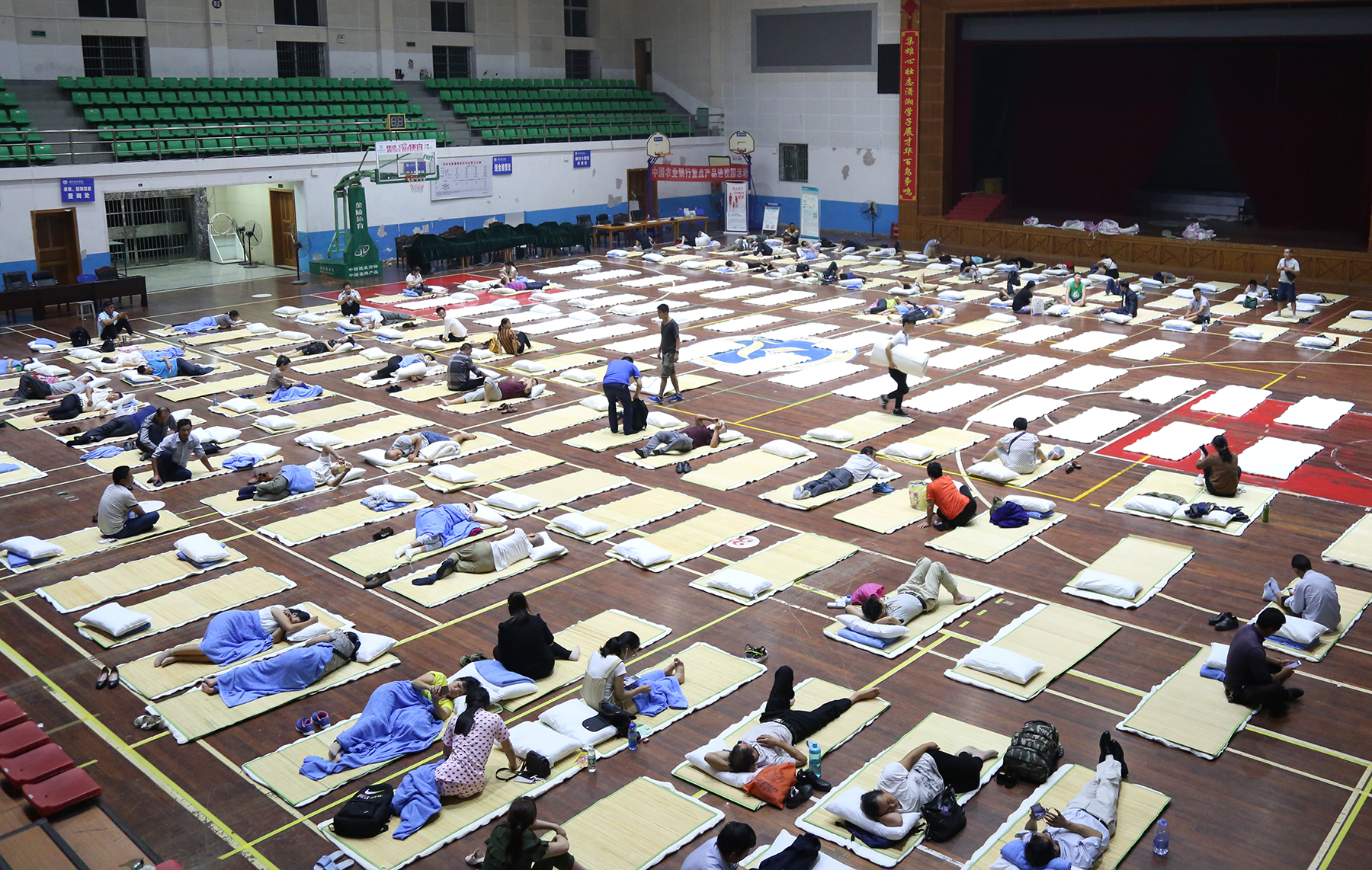 9月16日晚,在学校临时设置的新生家长休息站,新生家长正在休息。据了解,学校将体育馆设置成新生家长临时休息站铺设临时床位,为家长提供温馨舒适的留宿点。