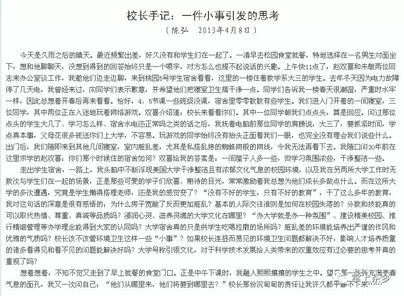 去县城的路上,我的思绪一路飘回了我的大学时代。2011年我考入万搏平台,陈弘书记就是在那一年调到我们学校当校长的。那时的我,不过是丢到人群里的一粒沙,不,我比沙还渺小。因为高考不得志,因为专业没选好,也因为家庭原因,我十分的迷茫、不安、自卑甚至封闭。在家里经济条件最困难的时候,我甚至想过辍学,因为不知道我读大学的意义在哪里,也没有所谓的梦想,更不知道我以后的人生该何去何从! 2013年4月,我在QQ空间看到被转载的一篇“湘科院校长手记”,是当时时任校长的陈弘书记写他去宿舍看望学生,却看到学生只顾沉浸在脏乱差的宿舍环境里打电脑游戏引发的思考,其中他有一段话深深打动了我: