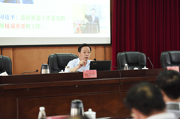 刘国华从意识形态领域切入,重点围绕“意识形态的作用与当前的斗争态势”、“需要高度警惕的几种错误思潮评析”、“牢牢掌握意识形态的领导权、管理权和话语权”三个方面分析了当前意识形态领域的态势。刘国华指出,意识形态工作的领导权、管理权、话语权紧密相连,各级党组织必须充分认识意识形态工作的重要性,有序落实意识形态工作责任制。他强调,努力打好意识形态领域的阵地战,坚持立德树人,努力培养合格建设者和可靠接班人,要切实做好以下五个方面:一是要坚持马克思主义的指导地位,牢牢掌握领导权;二是要培育和弘扬社会主义核心价值观,唱响主旋律;三是要传承中华传统文化,树立文化自信心;四是要强化抵制错误思潮的责任感,增强敏锐性;五是要加强网络建设和网络监管工作,掌握话语权。