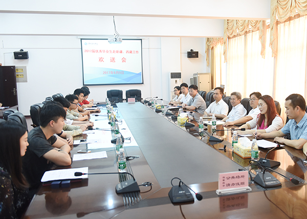 本网讯 6月9日上午,学校在行政办公楼六楼会议室召开2017届优秀毕业生赴新疆、西藏工作欢送会。校党委书记陈弘、校长曾宝成、纪委书记彭立威与即将奔赴新疆、西藏工作的十余位2017届优秀毕业生交流畅谈,送上了诚挚的祝福和嘱托。