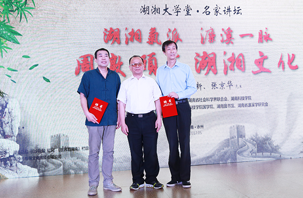 而随后演讲的张京华教授,主要谈论的是对周敦颐思想的理解和感悟。他同样提及了著名的《爱莲说》,却另辟蹊径,以“周茂叔窗前草不除”的典故说明周敦颐以万物为一体的“仁”的思想。周敦颐虽然以莲花自喻,但也尊重牡丹与菊花的存在,甚至连窗前碍事的杂草也不忍除去,由此周敦颐是一个泛爱万物的圣人。随后,张京华教授又从纯哲学的角度谈论了周敦颐的名篇《太极图说》。他生动论述了濂溪思想千年来对湖南思想文化的重大影响,劝勉在座学子,生长在濂溪故里,更应该努力学习濂溪思想,弘扬濂溪哲学。