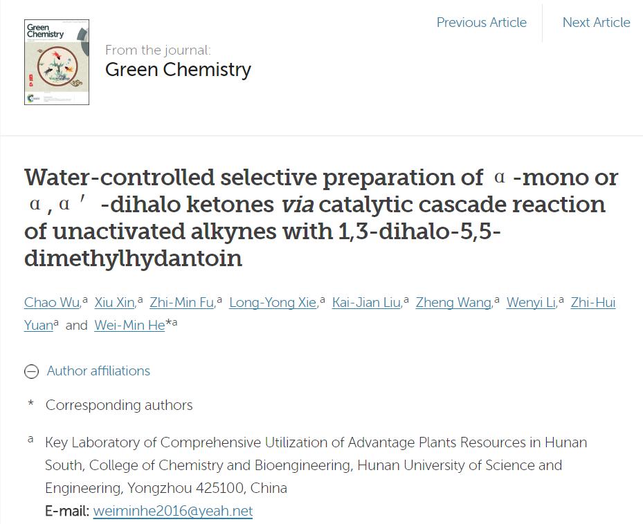 本网讯 近日,我校化学与生物工程学院吴超博士以第一作者身份,报道了一种绿色环保、可持续性的低成本选择性合成α-单卤代酮和α,α-二卤代酮的新方法,这一成果发表在英国皇家化学会高端SCI学术期刊Green Chemistry上,影响因子8.5,中科院分区大类一区。