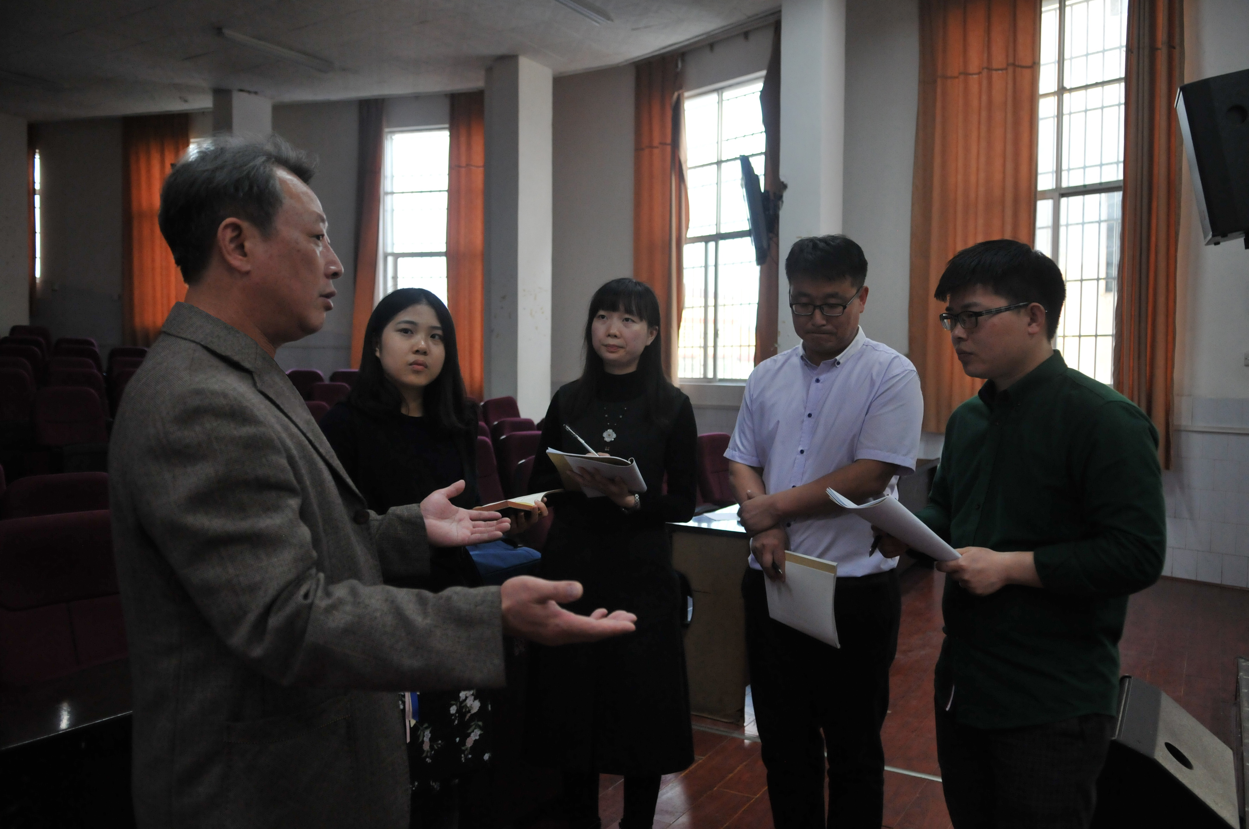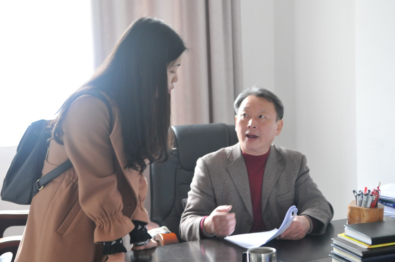 欧华恩院长和青年教师交流教学中遇到的疑惑,他喜欢和青年教师一起交流探讨,这样可以更好地对学生和教学工作进行了解。