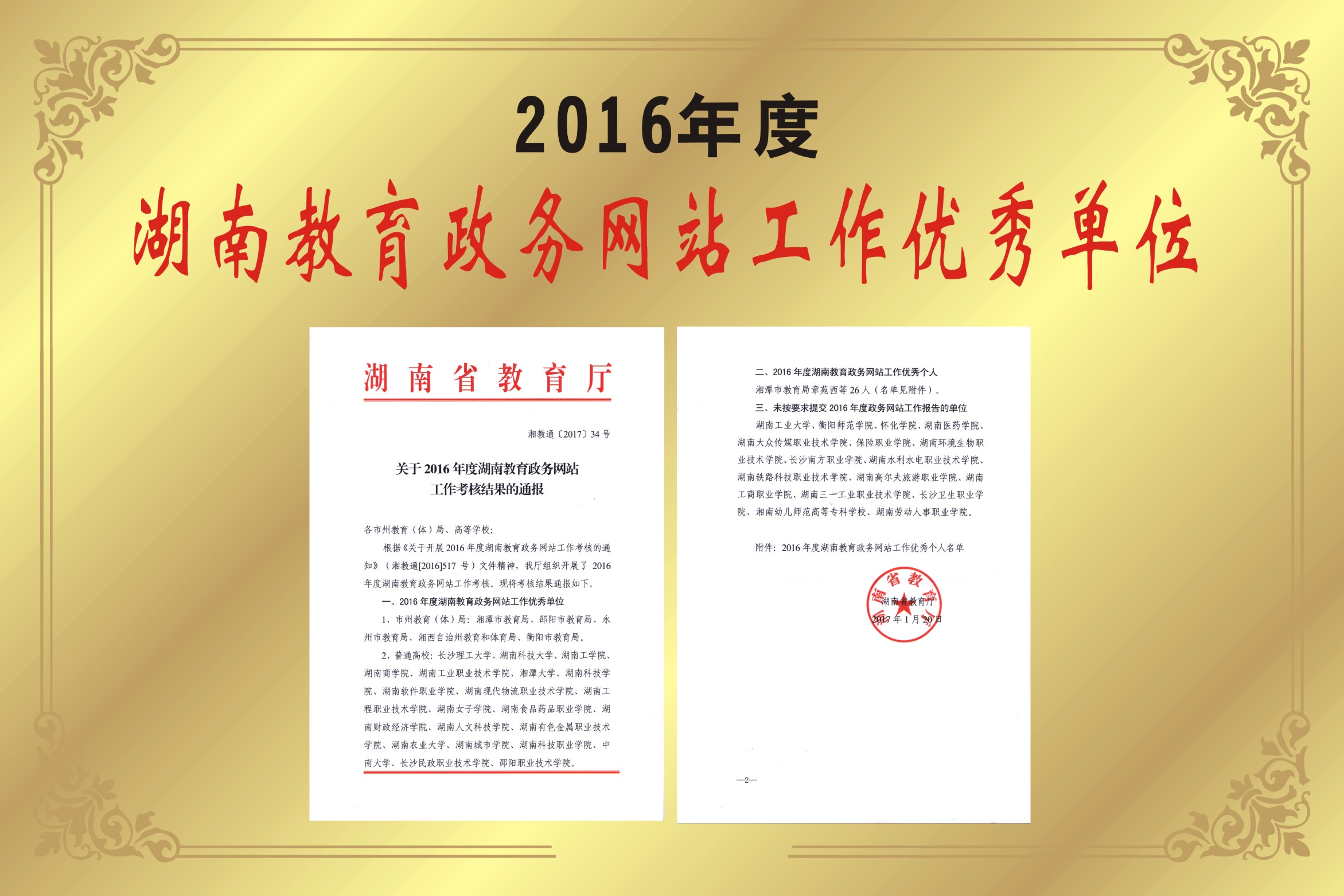 本网讯 近日,湖南省教育厅下发《关于2016年度湖南教育政务网站工作考核结果的通报》(湘教通【2017】34号),我校被授予2016年度“湖南省教育政务网站工作优秀单位”。全省教育系统共有26个单位获此殊荣。李斌获“2016年度湖南教育政务网站工作优秀个人”。
