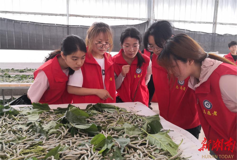 跨越百余公里,志愿者们来到新田县枧头镇新夏荣村的鑫晨桑蚕养殖合作社,这里漫山遍野的桑树翠绿欲滴,养蚕产业正蓬勃发展。沿着宽阔弯曲的山路前行,志愿者来到位于山顶的蚕房,一张张装满蚕茧的方格旁,工人们正热火朝天、干劲十足。
