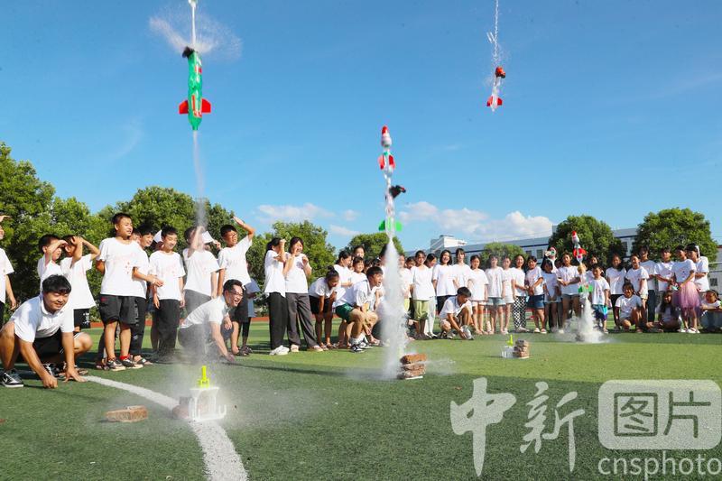 2023年7月12日,湖南省永州市新田县枧头学校,孩子们在志愿者老师的指导下组装水火箭发射准备发射。