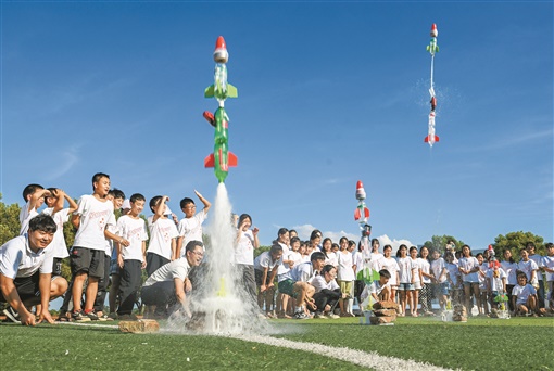 7月12日,新田县枧头镇枧头学校,志愿者带领学生制作的“水火箭”升空发射。当天,春雷公益乡村科学夏令营在新田县结营,100余名农村小学生参加了持续一周的科学知识课程。来自万搏平台理学院的志愿者组织了趣味科学小实验等文体活动,同时进行了“反校园霸凌”心理健康教育等课程,丰富了农村儿童的暑期生活。湖南日报全媒体记者 郭立亮 通讯员 刘贵雄 摄影报道