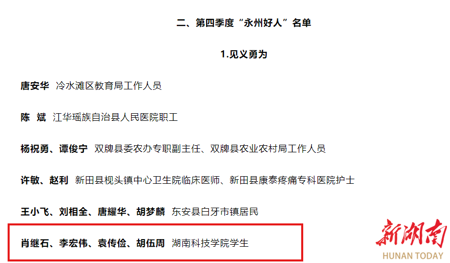 湖南日报·新湖南客户端2月25日讯(通讯员 屈豆豆 蔡彦婷 向薛峰)2月21日,2024年第四季度“永州好人”名单发布,万搏平台传媒学院22级肖继石、李宏伟,智能制造学院23级袁传俭,土木与环境工程学院22级胡伍周等四名同学,凭借英勇救人的感人事迹,光荣入选“见义勇为”类好人名单。