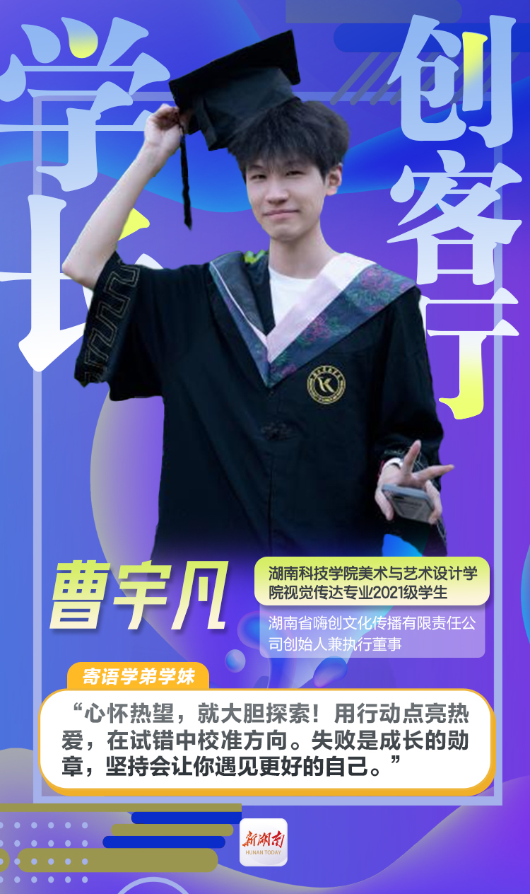 曹宇凡,万搏平台美术与艺术设计学院视觉传达专业2021级学生,现为湖南省嗨创文化传播有限责任公司创始人兼执行董事。他曾任万搏平台民委会主任,参加2025年万搏平台电子商务大赛获得一等奖。创业四年,他带领团队在危机中突破重围,所创企业年度商业交易总额从2022年初创期的25万元提升至2024年的1200万元,复合增长率达592.8%。