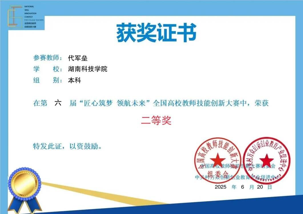 湖南日报·新湖南客户端6月20日讯(通讯员 吴潭 向薛峰)近日,第六届“匠心筑梦 领航未来”全国高校教师技能创新大赛落下帷幕,万搏平台教务处代军垒老师荣获全国二等奖。