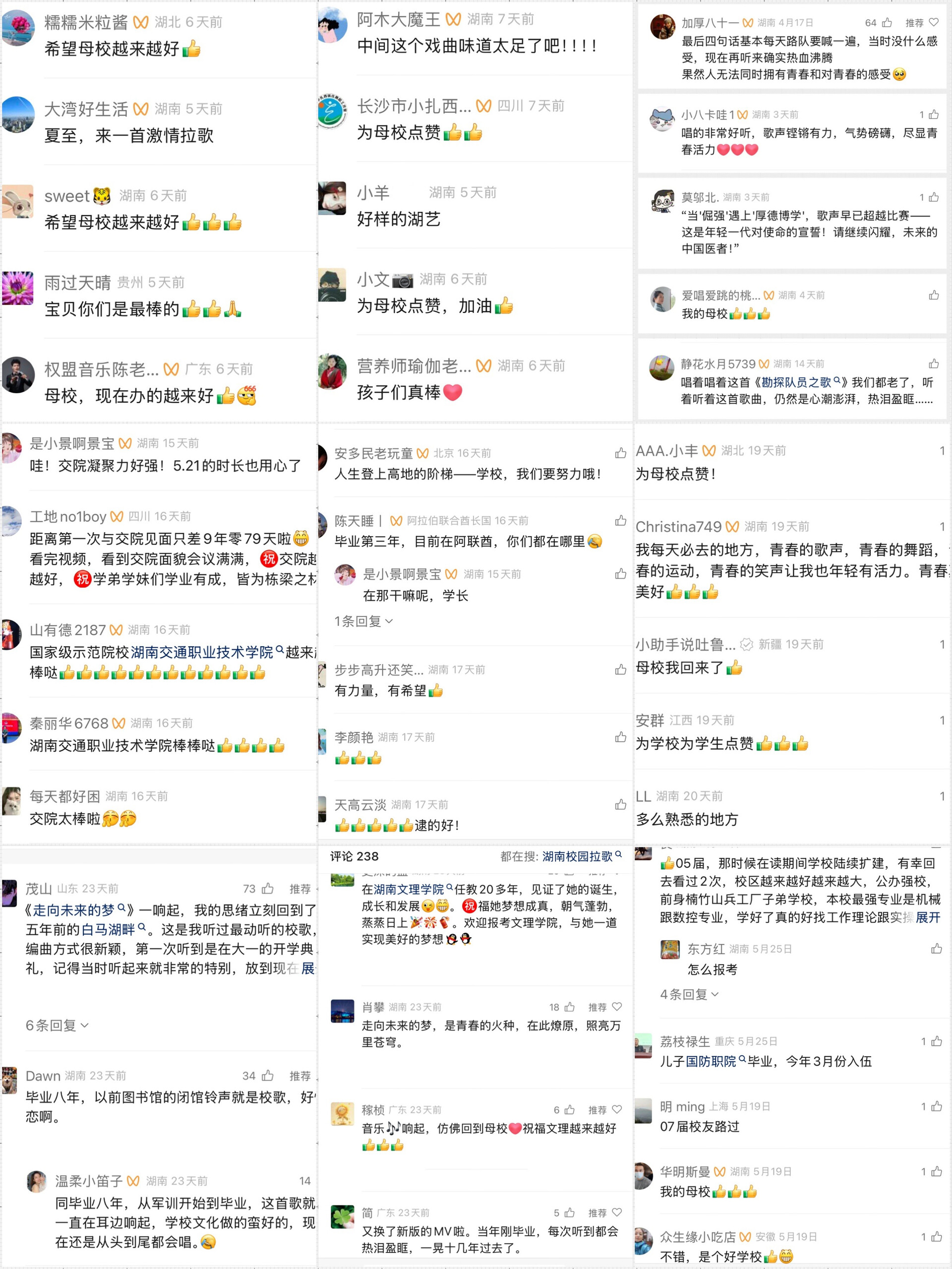 “熟悉的旋律,不同的唱歌人,当代青年已经责任上肩,展现出年轻人的担当作为。”“毕业八年,以前图书馆的闭馆铃声就是校歌,好怀恋啊!”“青春靓丽的师妹师弟,你们就是曾经的我!”“新学期开学,我也上大学了……”每日拉歌活动视频在湖南教育发布APP等融媒平台发布后,都会引发网友热评、热议、热传,校园好声音视频的留言区,时常成为热心网友们的“许愿池”。期间,还有很多外省师生留言、关注,积极为湖南校园好声音加油点赞。