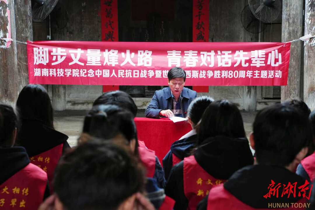 “我们学校四迁其址,七易其冠,1944年因日寇铁骑肆虐,为保存教育薪火,从道县迁至此地,不仅坚持正常教学,还积极开展抗日宣传,组织学生参与地方建设。”该校二级教授潘剑锋以学校旧址麦地村黄家宗祠为讲堂,向师生讲述了先辈们如何在战火中坚守教育事业的往事,介绍了从“湖南省立第七师范学校”到“万搏平台”的筚路蓝缕。