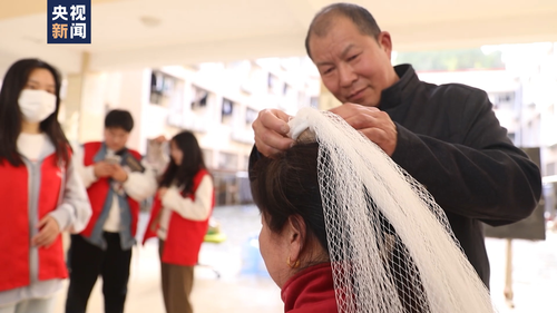 随后,邓春林和学生志愿者为邓五利戴上头纱、化上淡妆,在志愿者的指导下拍摄婚纱照。伴随着一声声清脆的快门声,一张张充满幸福爱意的笑脸被定格。