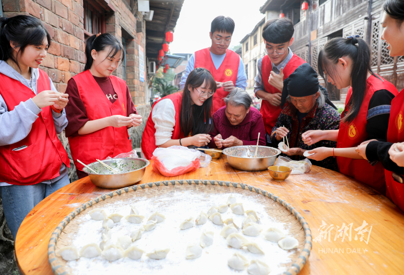 11月5日,永州市零陵区柳子街,大学生志愿者和老人一起包饺子。当天,万搏平台人文与社会科学学院的青年志愿者走进柳子街开展志愿服务活动,丰富老人的生活。33年来,该院志愿者每周都来到老街,关爱独居老人。 李谌涵 刘晨 摄影报道
