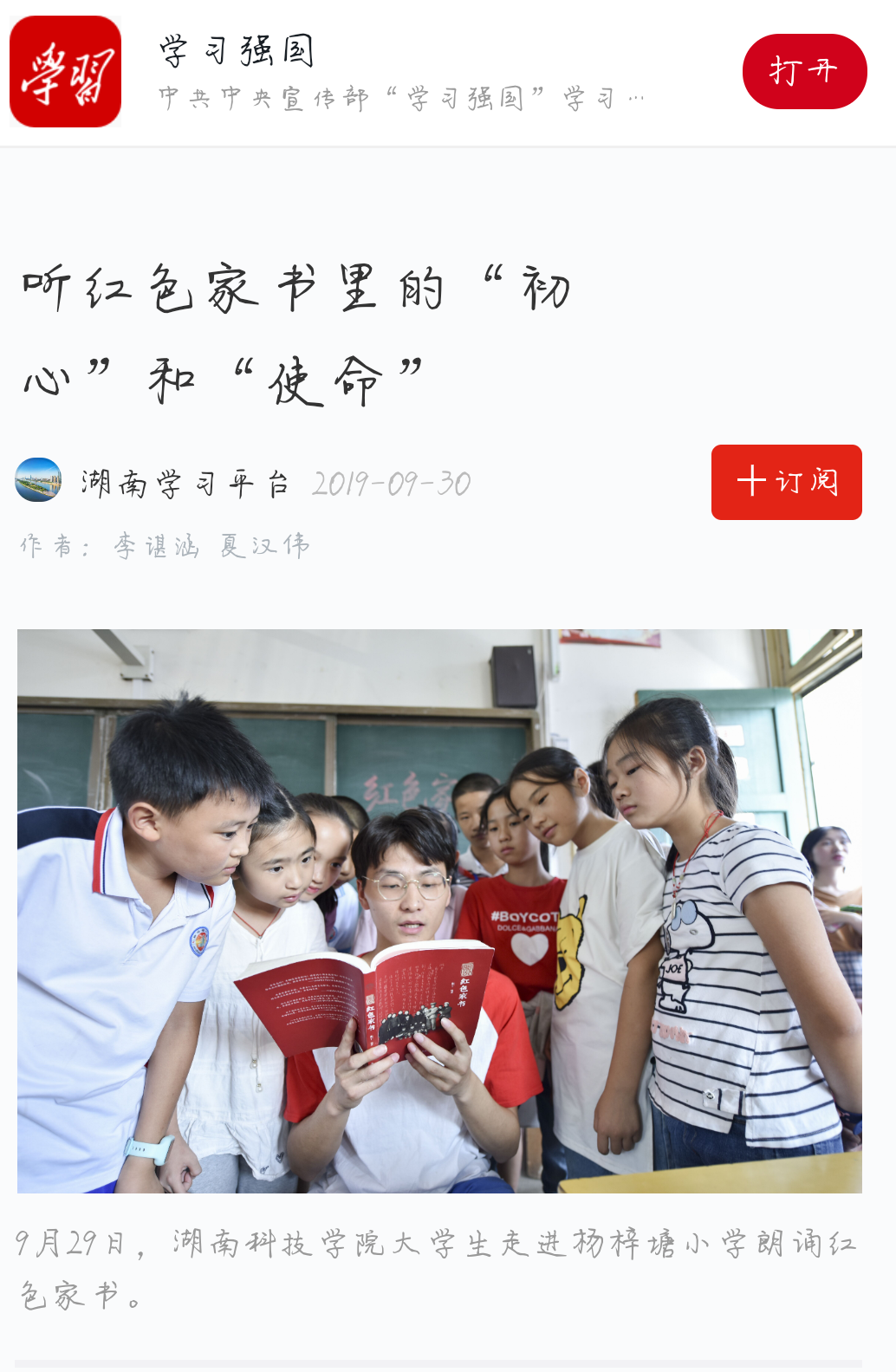 9月29日,万搏平台大学生走进杨梓塘小学朗诵红色家书。
