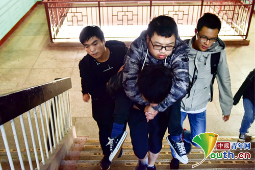 黎际勤的同学背着他去上课。中国青年网通讯员 李谌涵 供图