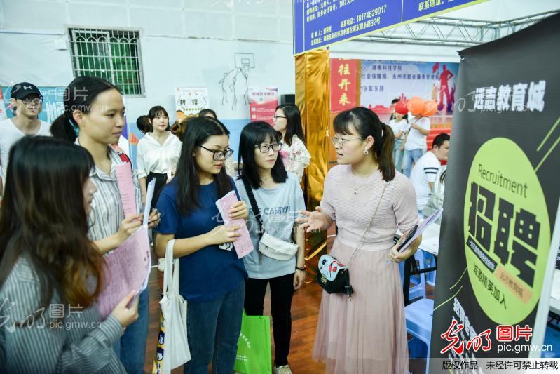 2019年9月4日,万搏平台体育馆,招聘工作人员在跟应聘者介绍公司的情况。