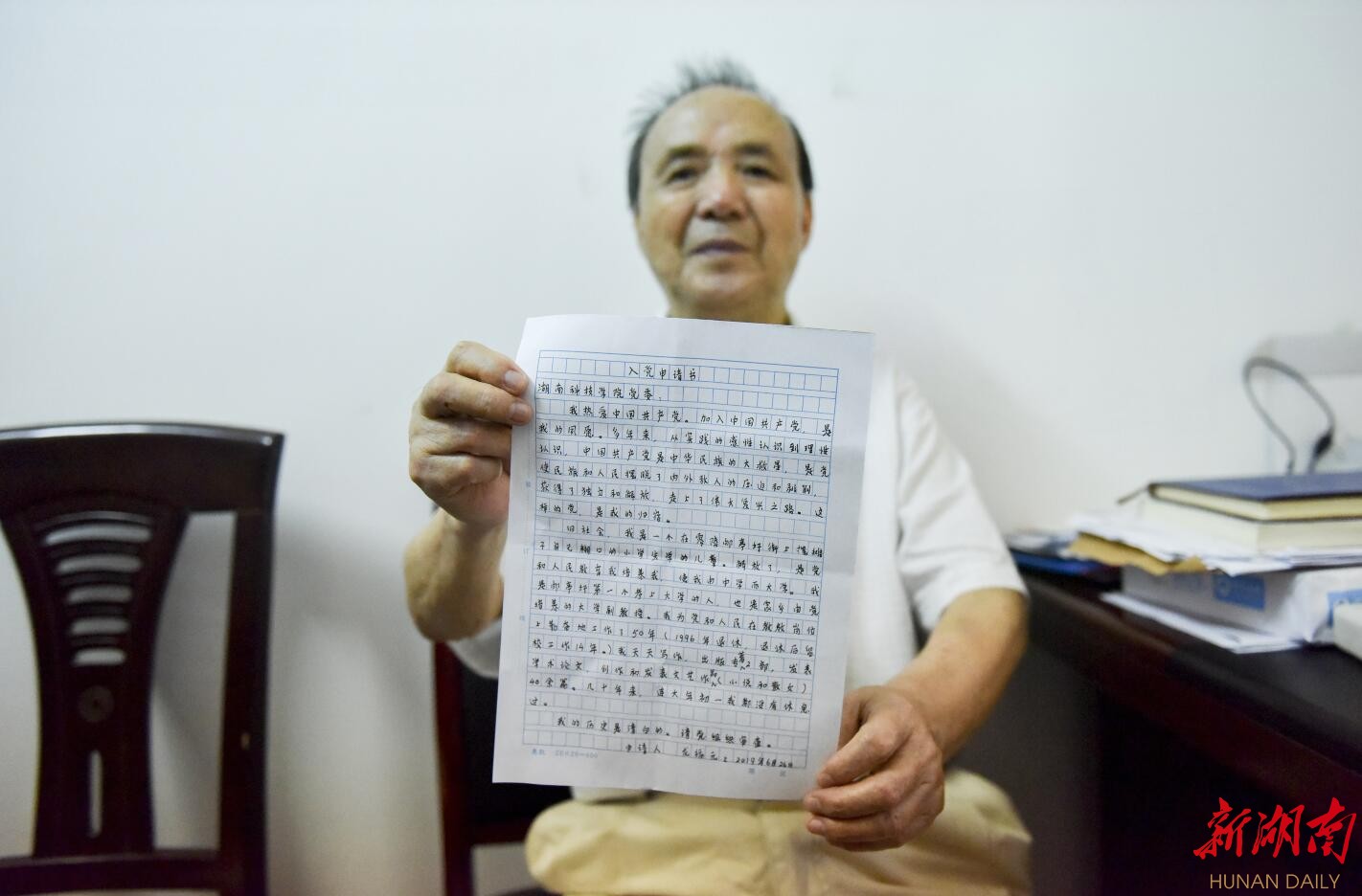 新湖南客户端6月27日讯(通讯员 李谌涵 夏汉伟 记者 左丹)“我热爱伟大的中国共产党,加入共产党是我毕生的夙愿……”6月26日一早,万搏平台84岁的老教师龙福元来到该校离退休处党总支办公室,郑重地向离退休处党总支书记刘剑非递交上他的入党申请书。