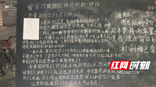 这两位暖心宿管阿姨分别叫周翠仙、王玲玉,今年刚来到学校从事宿舍管理工作,因为她们的灿烂笑容、暖心关切而收获了一大批粉丝,面对学生的热烈告白,周翠仙在宿舍楼小黑板上写下了一封回复学生爱意的表白信。“自从来到这里,我们看到你们一天天的进步,能主动遵守校纪校规,文明礼貌,尊重我们、理解我们、关心我们,热情洋溢地支持我们的工作,让我们在辛勤劳动之余,心里有一种莫大的欣慰和由衷的快乐!……在此我们衷心地向你们表白:我们和你们一家亲!”