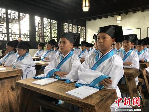 中新网永州5月12日电(盘林 毛黎明 何化继)5月12日,湖南永州市道县的100余名中小学生齐聚濂溪书院,集体诵读周敦颐的《爱莲说》,聆听国学老师讲述国学经典。