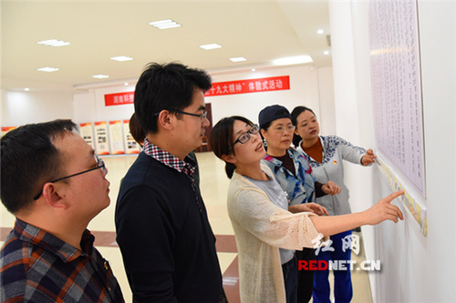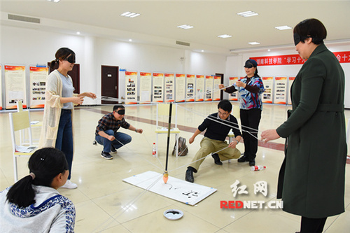 在热身环节中,党员同志们对党的十九大为什么要修改党章、党章修改工作有什么特点、党章修正案哪天生效等问题进行了重温。在对号入座环节中,党员同志们将盘子里的条块放入题板前下方相应的格子里的方式学习了党章历史沿革。在说明理由环节中,党员同志们随机抽取党章修改的十个方面内容题目,在规定的时间内讨论并分享答案,检验大家学习党章修改的十个方面的效果。在蒙眼写字环节中,党员同志们围绕随机抽取题目展开讨论,并概括出关键词,戴上眼罩在队长的指挥下共同将关键词写在纸上。