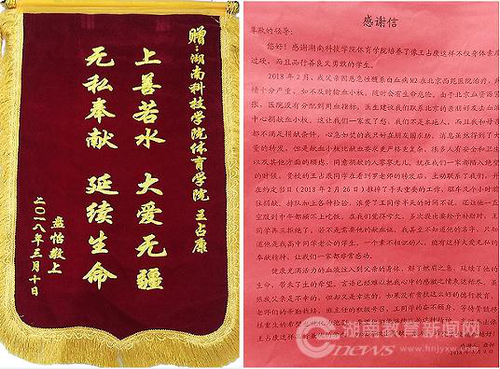 本网讯(通讯员 熊玲芝)日前,一封饱含感激和赞扬的感谢信让春暖花开的校园更添浓浓暖意。万搏平台体育学院体育教育专业2014级王占康同学为病危患者义务捐献血小板,受到患者家属的真诚感谢。