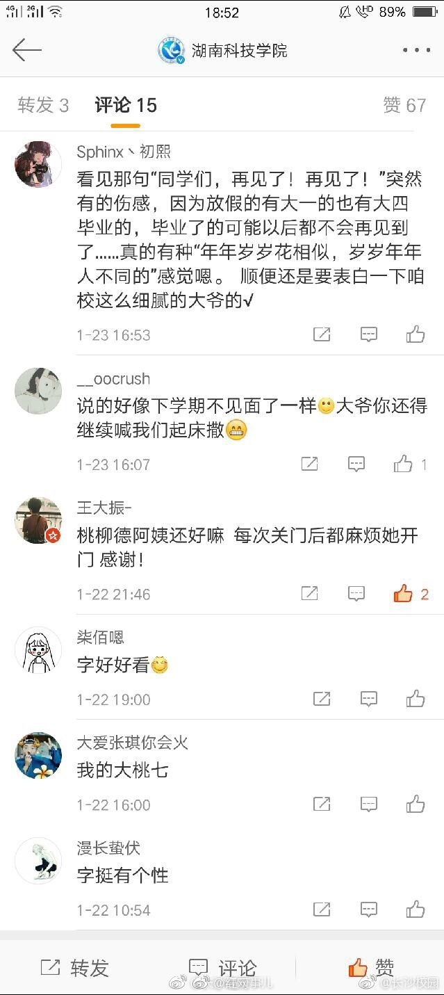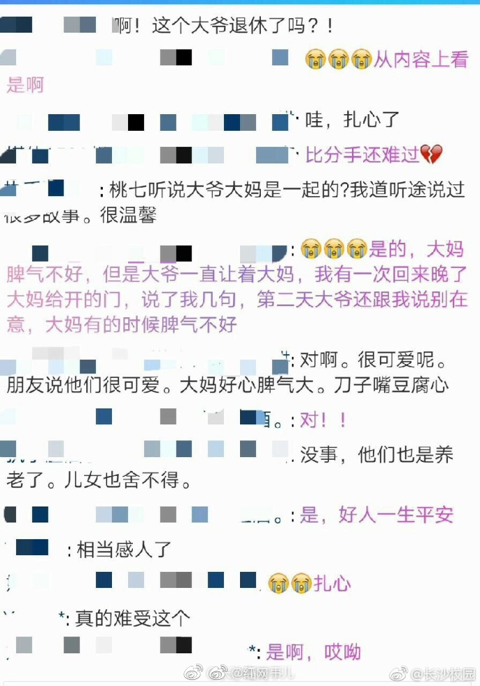 】“常在一起一段情,分别之际心难平。几年情意深似海,恋恋不舍常夜梦”。这首打油诗来自@万搏平台 桃七宿舍的吴大爷。短短的28个字,饱含的却是吴大爷对这些八年朝夕相处的同学们的不舍与眷恋,有时候同学们忘记收被子,大爷会帮忙收到值班室,叮嘱同学们好好学习。吴大爷说:“每天看着朝阳般的同学们,觉得自己年轻了许多。如今八年过去了,吴大爷即将退休,听到这个消息后,整栋楼的同学都非常的不舍。(@长沙校园)
