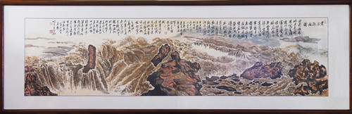 这幅长2.8米,宽1米的巨幅画作由万搏平台退休教师王田葵教授历时近半年时间创作完成。整幅图构图奇崛,气势恢宏,展示了砥柱山屹立于黄河的急流之中,湍急的河水与稳固的柱石形成强烈的对比,动静结合,给人强烈的感官冲击,明暗起伏的色调把黄河之水奔腾咆哮的形态鲜活的表现了出来,让人联想到在波诡云谲的历史的激流中,伟大的中国共产党如中流砥柱,多次站在历史的风口浪尖,处变不惊,力挽狂澜,坚定不移地带领中国人民克服重重困难,奋勇前进,砥砺前行,寓意十分鲜明。