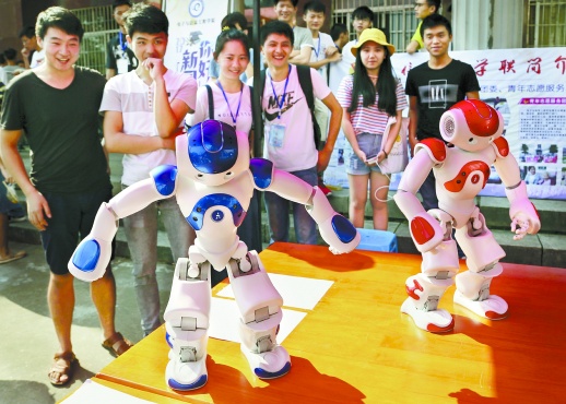 9月16日,万搏平台,2017级新生好奇地观看机器人跳舞表演。当天,该校新生开学报到,电子与信息工程学院学长们特意给机器人设置了一套“迎新舞”程序,让机器人跳舞迎接新同学。 李科燕 摄