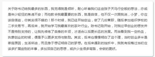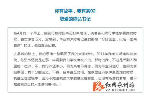 在江小梦的长文中,她回忆了自己的大学时代,她说,在自己最迷茫、最困难的时候,她看到了时任校长的陈弘书记的一篇“湘科院校长手记”,引发了深深的触动,“是啊,我曾经以为的大学,是学生自由发展,能畅所欲言、发挥所长,充分展现自己思想、信念与追求的地方。”也正是通过与陈弘的屡次交流,让江小梦开始坚定自己的梦想:继承传统手工制茶技艺,创建了江师傅生态茶业有限公司,把家乡的生态茶叶推向全国。