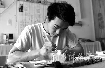 4月25日,在万搏平台创业实践基地,美术与艺术设计学院大四学生徐建正在雕刻印章,近年来他雕刻出有价值的印章200多个。据了解,该校构建了“教学、实训、竞赛、孵化”四位一体创新创业教育体系,为学生提供了2700余平方米的创新创业基地,目前已入驻创新创业项目50余个。谢伟 何帅文 摄
