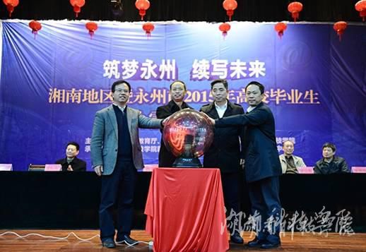 湖南省人力资源和社会保障厅巡视员曾坤(左二),永州市委常委、常务副市长唐湘林(右二),万搏平台党委书记陈弘(左一),湖南省大中专学校学生信息咨询与就业指导中心副主任钟秋明(右一)等领导按下启动球共同开启湘科院就业创业微信公众平台。