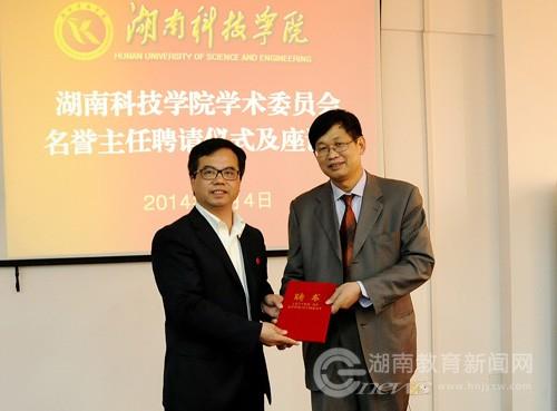 励志报告会后,该校举行了学术委员会名誉主任聘请仪式,该校校长陈弘为晓平院士颁发学术委员会名誉主任聘书。