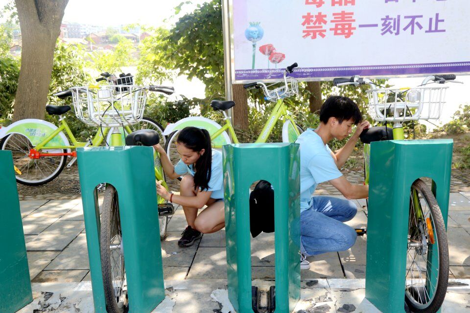 志愿者们拎着水桶,拿着抹布来到零陵区朝阳公园租赁点和市四医院租赁点,朝阳公园租赁点的自行车由于被洪水淹过,车身裹上了一层淤泥。志愿者从车桩到车手把、到坐垫、到车身的各个角落,都用抹布进行了认真擦拭。经过两小时的劳动,70多辆自行车被擦得干干净净。