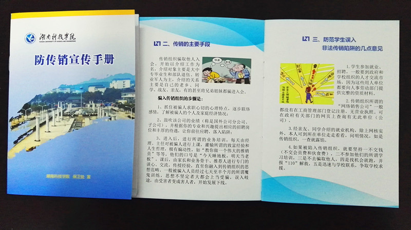 “这样的防传销宣传小册子不但非常精美,而且十分实用,对于即将离开学校奔赴工作岗位的毕业生来说,无时无刻不在警惕我们预防传销,防止自己和身边的亲朋好友被骗”,人文学院大四的杨同学表示。(保卫处)