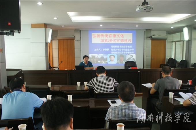 本网讯(通讯员 李艳)近日,我院哲学教授、硕士生导师、省青年骨干教师李钟麟教授应邀前往祁阳县教育局作题为《弘扬传统官德文化,加紧现代官德建设》的专题讲座。